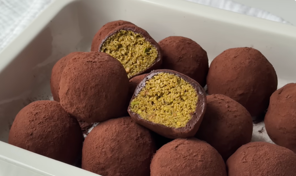 화이트 커버춰 초콜릿을 전자레인지에 녹인 뒤, 구운 카다이프, 피스타치오 페이스트, 다진 피스타치오를 함께 섞습니다. 제가 여러 번 만들어본 결과, 다진 피스타치오를 추가하면 씹는 맛이 확실히 살아나고 풍미도 훨씬 좋습니다. 비율은 카다이프 100g 기준으로 피스타치오 페이스트 60g, 다진 피스타치오 20g 정도가 적당했습니다. 랩으로 덮어 냉장고에 최소 1시간 이상 굳힌 후, 5.5cm 스쿱으로 약 42g씩 둥글게 빚어주면 됩니다.