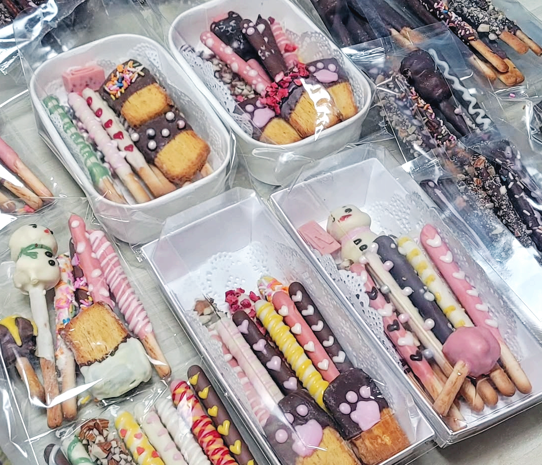 화이트 초콜릿은 특별한 용도가 있습니다. 말차가루를 섞어 연두색 말차 초콜릿을 만들거나, 딸기 파우더를 넣어 핑크색 딸기 초콜릿을 만들 수 있기 때문입니다. 그래서 저는 화이트 초콜릿을 다크 초콜릿보다 더 많이 준비하는 편입니다. 막대과자는 시중에서 파는 참깨스틱을 주로 사용합니다. 빼빼로와 비슷한 길이와 굵기라서 초콜릿을 입히기에 딱 좋습니다.