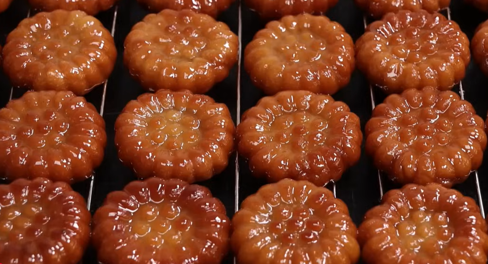 - 성형: 반죽을 밀고 접어 결을 만든 뒤 오얏꽃 모양으로 찍는다